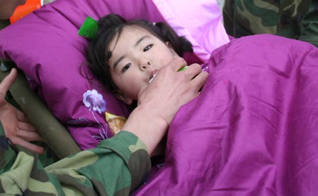 Soldiers feed milk to Song Xinyi, a 3-year-old earthquake survivor, in earthquake-hit Beichuan County, Southwest China's Sichuan Province, May 14, 2008. [Xinhua]