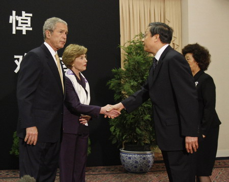 (L-R) US President George W. Bush watches on as First Lady Laura Bush shakes hands with China's Ambassador to the United States Zhou Wenzhong, with his wife Xie Shumin, after Bush signed a condolence book for victims of China's earthquake at China's Embassy in Washington May 20, 2008. [Agencies]