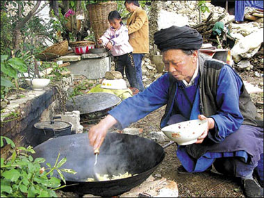 Cao Qingxi, a resident of Keke village, prepares lunch, sitting on the rubble of his collapsed house. Huang Yiming