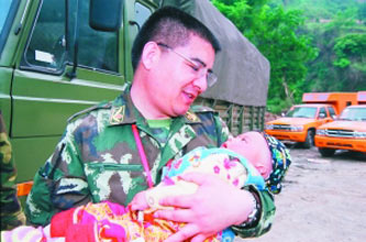 Chen Guangbiao, head of a mid-sized private company in Jiangsu province, holds a baby in his arms in quake-hit Sichuan. [File photo]