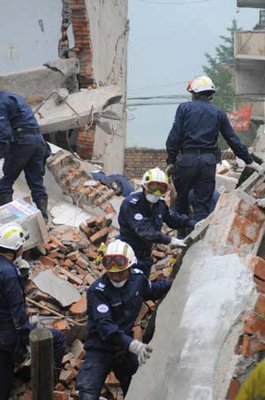 Members of a rescue team from Singapore search for survivors in the quake-hit Hongbai Town of Shifang City in southwest China's Sichuan Province, May 17, 2008. [Xinhua]