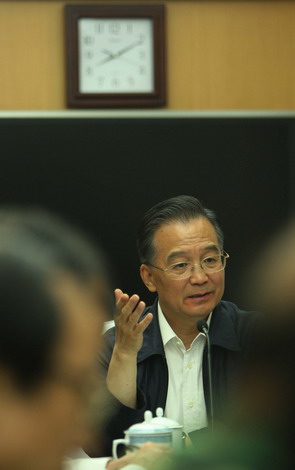 Chinese Premier Wen Jiabao speaks at a disaster-relief meeting on a train, June 5, 2008. Wen Jiabao landed on the dam of the quake lake Thursday as water flowed into a sluice built a few days ago. [Xinhua]
