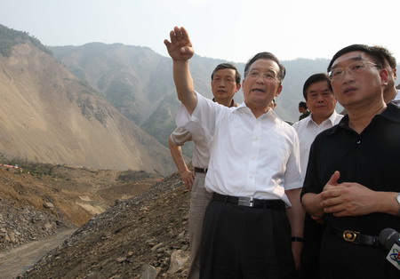 Chinese Premier Wen Jiabao (front L) speaks as he inspects the drainage of the Tangjiashan quake lake in southwest China's Sichuan Province on June 5, 2008. Wen Jiabao landed on the dam of the quake lake Thursday as water flowed into a sluice built a few days ago. [Xinhua]