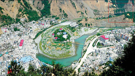 | A combo photo shows a view of the earthquake-hit county of Beichuan before the flooding and after a controlled draining of the nearby Tangjiashan lake (in red frame) on Tuesday. [Agencies] |