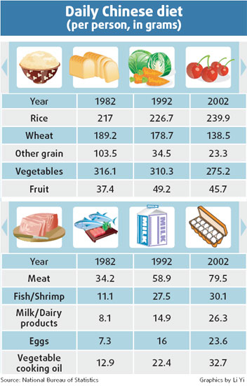 It is one example of how, along with the country's economic growth, changes in diet that started with urbanites have spread to farmers such as Qiao. Each person in the country now consumes 5 percent more meat, 10 percent more milk and 8 percent more cooking oil annually than five years ago, figures from the National Bureau of Statistics have shown. Improvements in diet had already been making an impact. A survey by the Ministry of Health in 2002 showed that the average height of children between the ages of 3 and 18 rose 3.3 cm between 1992 and 2002. The rate of malnutrition among the children dropped by more than half in the same period. However, amid a surge in global food prices, a number of fingers have pointed to changes in Asian diets including those in China as the culprit for the food price hikes. A number of US economists, for example, have said that a major reason for soaring food prices is the increasing demand for meat and dairy products in China and India, the two most populous countries. Since it takes 7 kg to 8 kg of grain to produce 1 kg of meat, higher meat and dairy consumption is said to require more grain. With Chinese eating more meat, drinking more milk and using more cooking oil, there is also a corresponding spike in demand for feed to produce a growing population of pigs and other livestock, critics have said. Industry publication Biofuels Digest editor Jim Lane said in a report that "an additional 277 million tons of grain would be needed to support China at parity with the US. That would take 68 million acres to grow. "There is not that kind of arable land available anywhere in the world, whether we use grains for renewable energy or not."