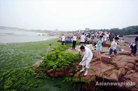 Local residents volunteer to clear up the algae in Qingdao, east China's Shandong province July 1, 2008.More than 10,000 workers and 1,000 boats have been mobilized to clear the blue-green infestation in the host city of Olympic sailing events. [Asianewsphoto]