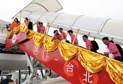 Tourists board the first direct chartered flight from Xiamen to Taiwan July 4, 2008. [Xinhua] Click for more photos