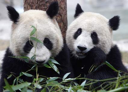 Young giant pandas eat a meal of bamboo inside their enclosure at Beijing Zoo July 10, 2008. Eight giant pandas are part of a special exhibit at the zoo for the upcoming Beijing 2008 Olympic Games. [Agencies]
