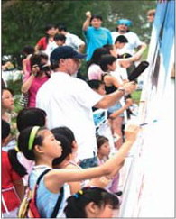 The official name of the piece is "Hands Across The Oceans" and it was commissioned for the Beijing Games' Cultural Festival. Wyland worked with a team of designers, as well as Chinese artists and children from local and international schools. "China faces a lot of environmental challenges, but the Olympics is a great opportunity for these issues to be addressed," he said. Monday, a group of Beijing youngsters helped put the finishing touches to the piece, adding colorful images of fish, whales and octopuses. "The animals look so happy, it's as though they are saying 'Do not disturb'," Sui Lei, who watched the mural's unveiling, said. Julia Zhou said she was delighted that her daughter Angie was selected to be part of the team of child painters. Although she and her husband moved to the United States when Angie was a baby, they flew back when Angie was selected. "The project is significant, and through it, Angie can contribute to society," Zhou said. Angie Zhou said: "It's meaningful seeing everyone do their part to care for the Earth." Other children expressed their thoughts. Yan Yi Chen, 11, said: "Water is precious. Without it, the fish I painted can't survive."