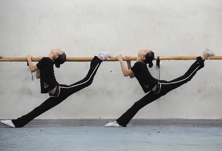 Students practise physical skills for Lu opera at an art school in Hefei, Anhui province July 22, 2008. About 38 students, aged 10 to 20, receive musical and physical training at the school for Lu opera, a traditional folk opera of Anhui, local media reported. [Agencies]