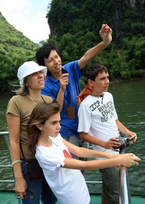Foreign visitors appreciate the scenes on a pleasure boat running on the Lijiang River in Guilin, southwest China's Guangxi Zhuang Autonomous Region, July 24, 2008. Guilin, a well-known city for its mysterious karst peaks, embraces its travel peak recently. [Xinhua]