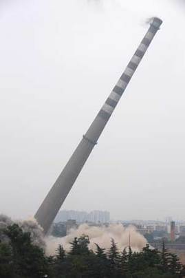 The 210-meter-high chimney of Huaneng power plant is demolished in Chengdu, capital of southwest China's Sichuan Province, July 25, 2008. Belonging to Huaneng power plant closed in June 2007, the chimney was demolished on Friday as a gesture of saving energy and reducing carbon dioxide emission. [Xinhua]