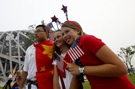 A Chinese man poses for a picture with girls from the US outside the Bird's Nest Olympic Stadium in Beijing on August 8, 2008 just hours before the start of the 2008 Beijing Olympic Games' opening ceremony in the Chinese capital. [Agencies]