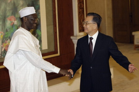 Chinese Premier Wen Jiabao meets Chad's Prime Minister Youssouf Saleh Abbas (L) at the Great Hall of the People in Beijing on August 8, 2008. Abbas is one of many world leaders arriving in the Chinese capital to attend the opening ceremony of the 2008 Beijing Olympic Games. [Agencies]