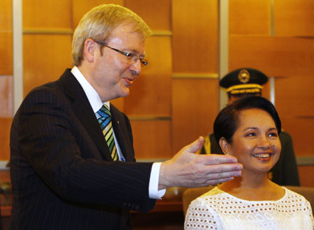 Australia's Prime Minister Kevin Rudd (L) meets with the Philippines President Gloria Arroyo in Beijing August 9, 2008. [Agencies]