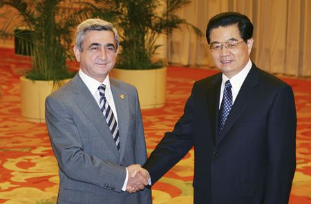 Chinese President Hu Jintao (R) meets Armenian President Serzh Sarkisian at the Great Hall of People in Beijing August 9, 2008. [Agencies]