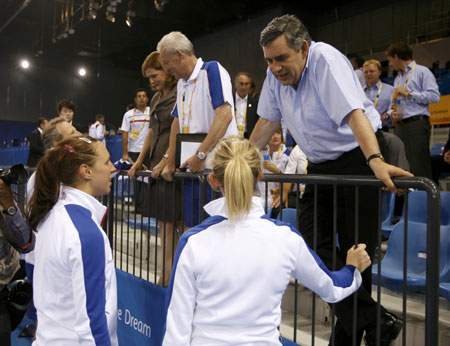 British Prime Minister Gordon Brown (top R) speaks with competitors Heather Fell (L) and Katy Livingstion (R) of Britain during the fencing event of the women's modern pentathlon competition at the Beijing 2008 Olympic Games August 22, 2008. On top-L : Gordon Brown's wife Sarah. [Agencies]