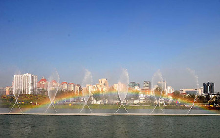 A rainbow rises along side fountains against the clear sky in Beijing Olympic Park Friday. [Xinhua]