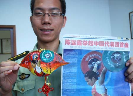 Border police officer Huang Baobang displays his painting of Chinese weightlifting player Chen Xiexia (L) on a crab shell in Zhoushan, east China's Zhejiang Province, August 24, 2008. [Xinhua]