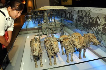 A visitor looks at the replica of a bronze chariot from the Qin Dynasty (BC 221-206) at the Ningxia Transportation Museum in Yinchuan, capital of northwest China's Ningxia Hui Autonomous Region, August 22, 2008. The museum was opened to public on Friday. The museum, including 10 exhibiting sections, presents the transportation development and achievement both in history and mordern times in Ningxia.[XInhua]