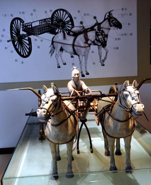 The replica of a chariot from the Western Zhou Dynasty (BC 1046-771) is shown at the Ningxia Transportation Museum in Yinchuan, capital of northwest China's Ningxia Hui Autonomous Region, August 22, 2008. [Xinhua]