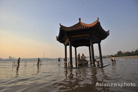People play at a flooded bank of the Yangtze River in Wuhan, capital of central China's Hubei province, September 2, 2008. Heavy rains are expected to hit the Yangtze River over the next three days, threatening the city as the water level nears the danger line. [Asianewsphoto]