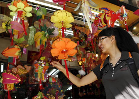 A woman chooses lanterns for the Mid-Autumn festival at a store in Hong Kong on September 7, 2008. The Mid-Autumn Day, or Moon Festival, a traditional Chinese holiday for family reunion and eating moon cakes outside under the moon, falls on the September 14 this year. [Xinhua]