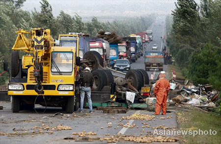 Firefighters clear the site as traffic is halted after a truck collision in Changchun, Jilin province on September 10, 2008.[Asianewsphoto]