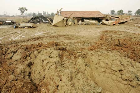 After a preliminary investigation, the team believed it was an "accident of grave responsibility" resulting from the illegal operation of an unlicensed ore mine. "It is the most grave accident that involves the largest death toll so far this year," Wang said. "The rising accidents disclose local governments' poor supervision on work safety. Those responsible must be dealt with seriously." As of 8 p.m. Thursday, a rescue team of more than 3,000 people, with the aid of 160 excavators, was continuing the rescue operation. The injured, except one seriously hurt, were in stable conditions, doctors said. The disaster happened around 8 a.m. Monday when the bank of a pond holding waste ore dregs burst at the Tashan Mine in Xiangfen County, Linfen City. In total, 268,000 cubic meters of sludge deluged over an area of 30.2 hectares. The mud-rock flow damaged buildings, trade markets and some residences lying about 500 meters downstream. Rescue work is underway and the specific number of people trapped underneath the rubble is still under investigation.