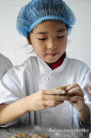 A girl from No 4 Primary School of Nanyang, Henan province, is making a mooncake at the city's Dashifu bakery on Tuesday. The school organized the activity for students to learn about the traditions of the Mid-autumn Festival. [Asianewsphoto]
