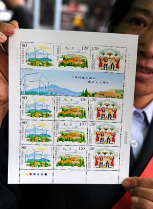 Updated: 2008-09-24 10:00 A post officer shows commemorative stamps during the launching ceremony of a set of commemorative stamps and envelopes in Yinchuan, capital of northwest China's Ningxia Autonomous Region, on Sept. 23, 2008. The commemorative collections were officially issued on Tuesday for the 50th anniversary of the founding of the Ningxia Hui Autonomous Region.[Xinhua] |
