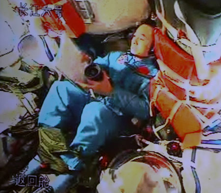 This video grab, taken on September 26, 2008 at the Beijing Space Command and Control Center in Beijing, shows Chinese astronaut Jing Haipeng holding a camera, ready to take pictures in Shenzhou VII while two other astronauts are busy assembling the indigenous Feitian extra-vehicular activity (EVA) suit. Astronauts aboard the Shenzhou VII spacecraft, China's third manned spaceship, began to assemble the suit and test its obturation and functions Friday in preparation for the first spacewalk, planned for Saturday afternoon. [Xinhua]