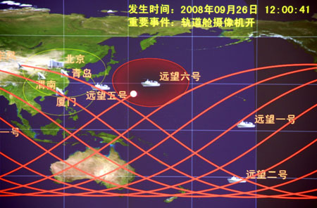 This video grab, taken on September 26, 2008 at the Beijing Space Command and Control Center in Beijing, shows the orbit of Shenzhou VII manned spacecraft. [Xinhua]