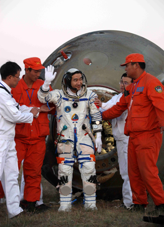 Updated: 2008-09-28 18:13 Chinese astronaut Zhai Zhigang waves his hand after the successful landing of the re-entry module of the Shenzhou VII spaceship in North China's Inner Mongolia, September 28, 2008. [Xinhua] |