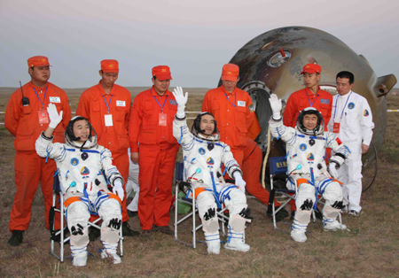 Asstronauts Jing Haipeng, Zhai Zhigang and Liu Boming wave their hands after they return to Earth aboard the Shenzhou VII module in the grasslands of North China's Inner Mongolia Autonomous Region, September 28, 2008. [Xinhua]