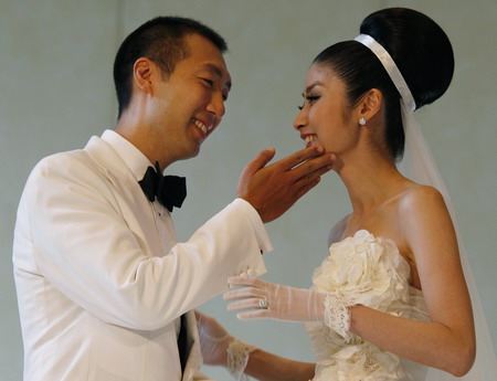 Hong Kong singer and actress Kelly Chen and her husband Alex Lau smile during their wedding ceremony at a hotel in Hong Kong October 2, 2008. [Agencies]