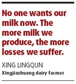 Xing now earns a bit more than 100 yuan ($15) a day. He is losing money because the feed alone costs 200 yuan ($30) a day, he said. To stem his losses, another dairy farmer in the village recently sold his cow to the slaughterhouse for about 6,000 yuan ($878), Xing said. "I'm not willing to sell my cows yet. They are good cows and some can produce 60 to 70 kg of milk a day," he said. "I'll wait for a bit longer, but if things don't improve soon, I may have no other choice but to sell my cows." The plight of dairy farmers have become so serious that authorities now fear that if they are forced to slaughter their cows, it will trigger a collapse of the mainland dairy industry. Official figures from Hebei show that from Sept 14 to 16, about 5,900 tons of raw milk were dumped because major dairy companies stopped buying fresh supplies. Similar cases have been reported in all the major milk-producing regions in the country. ![]() Last Thursday, the central government set aside 300 million yuan ($43.9 million) in subsidies for dairy farmers. According to the Ministry of Health, the subsidies will mainly go to dairy farmers who suffered the greatest financial losses in the five major dairy-producing provinces of Hebei, Liaoning, Shanxi, Shandong and Henan, as well as the Inner Mongolia autonomous region. The ministry has also asked local governments to increase their subsidies to dairy farmers and to urge dairy companies to continue buying milk as long as supplies meet quality standards. Some farmers may not be able to wait until these policies take effect. "The only subsidy I've gotten so far is 200 yuan for a cow," said another dairy farmer, Xing Zhanchun. The 57-year-old said he is now willing to sell his cows and three female calves to cut his losses. He also needs money quickly for his only son's wedding. "Other than selling them, the only way to cut my losses is to feed them less in order to reduce the amount of milk they produce," Xing Zhanchun said. "We even make our steamed buns with the fresh milk now." |