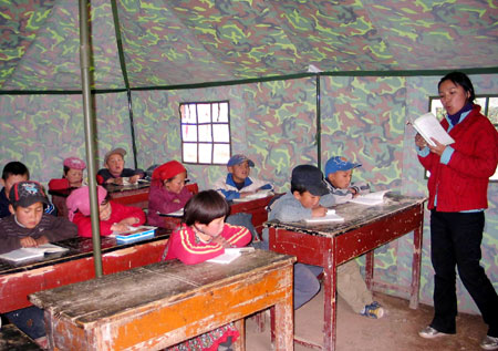 A primary school teacher gives a class to her students in a makeshift classroom in Ulugqat county, northwest China's Xinjiang Uygur Autonomous Region, October 13, 2008. Life and work are returning to normal in the quake-hit areas after a 6.8-magnitude earthquake shook Ulugqat county in Xinjiang, on October 5, 2008, causing no casualties but 721 collapsed houses. [Xinhua]