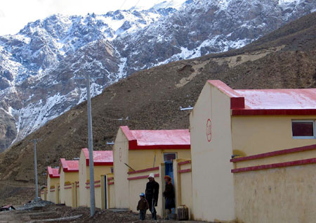 Updated: 2008-10-16 09:49 ![]() Local residents walk in front of their newly-built house in Ulugqat county, northwest China's Xinjiang Uygur Autonomous Region, October 13, 2008. Life and work are returning to normal in the quake-hit areas since a 6.8-magnitude earthquake shook Ulugqat county in Xinjiang, on October 5, 2008, causing no casualties but 721 collapsed houses. Over 100 residents in the quake-hit areas were relocated to emergency shelters and another 100 will move into newly-built houses. [Xinhua]