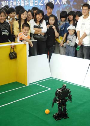 Visitors look at a robot which can play football during a robot expo in Hangzhou, East China's Zhejiang Province, October 18, 2008. More than 10 kinds of robots are exhibited at this expo. [Xinhua]