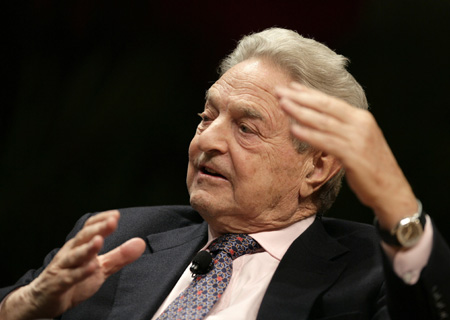 Chairman of Soros Fund Managment George Soros speaks at the Massachusetts Institute of Technology during a conversation about "The new paradigm for financial markets" in Cambridge, Massachusetts October 28, 2008. Soros expects the global financial crisis to reduce the hedge fund industry to as little as one-third of its current size, he said on Tuesday. [Agencies]