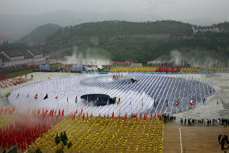 Performers play Taichi during the opening ceremony of the 3rd World Traditional Wushu Championship at Wudang Mountain in central China's Hubei province, October 30, 2008. Some 2,000 athletes from 69 countries and regions, including Britain, the United States, Poland, Russia and Greece, are competing for this year's contest in Wudang Mountain. [CFP]