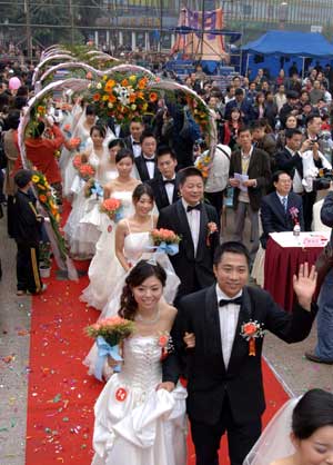 Thirty migrant worker couples walk on red carpet during a group wedding in southwest China's Chongqing Municipality, November 2, 2008. [Xinhua]