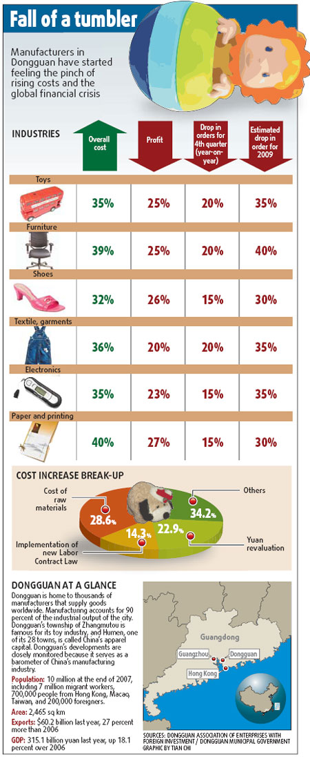 Toy makers in Dongguan have seen their orders drop by 20 percent for the last quarter of this year. And their manufacturing cost has risen more than 35 percent, according to the city's foreign investment enterprises' association. But despite everything, Yu is surprised by Smart Union's sudden closure because such big firms should be able to cope with such crisis through other means, including laying off some staff. Yu has cut the number of workers in his PC monitor factory from more than 2,400 last year to about 1,300. "Sudden 'escapes' are rarely seen in big firms' cases." If firms as big as Smart Union start jumping ship, it can pose a social problem, too, with thousands of migrant workers becoming jobless. Apart from paying the Smart Union's laid-off workers their arrear salaries, the Dongguan government has also set up a 1-billion-yuan fund to help local firms tackle problems. Moreover, the city is trying to devise measures to prevent firms from closing down suddenly, says Fang Shaoming, a director in the general office of Dongguan's bureau of foreign trade and economic cooperation. "The government is thinking of how better to support local firms especially legally, under which new measures would state clearly the responsibility of the firms." |