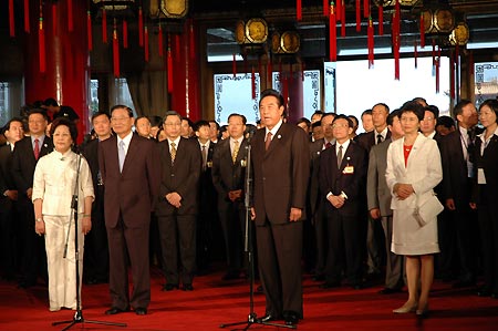 Chen Yunlin (R Front), president of the Chinese mainland's Association of Relations Across the Taiwan Straits, delivers a speech during the welcoming ceremony held by Chiang Pin-kung (2nd L Front), chairman of Taiwan's Straits Exchange Foundation, in Taipei, November 3, 2008. Chen Yunlin arrived in Taiwan on November 3 for a five-day trip. [Xinhua]