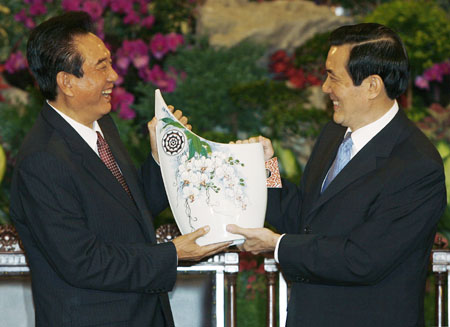 Chen Yunlin, president of the mainland's Association for Relations Across the Taiwan Straits (ARATS) receives a gift from Taiwan leader Ma Ying-jeou (R) during a meeting at the Taipei Guest House in Taipei November 6, 2008..[Agencies]