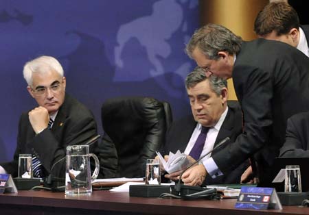 Britain's Chancellor of the Exchequer Alistair Darling (L) and Prime Minister Gordon Brown (2nd R) confer with advisors during first session at the G20 Summit on Financial Markets and the World Economy at the National Building Museum in Washington, November 15, 2008.[Agencies]