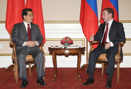 Russia's President Dmitry Medvedev (R) and Chinese President Hu Jintao hold a bilateral meeting after the Summit on Financial Markets and the World Economy in Washington, November 15, 2008. [Agencies]