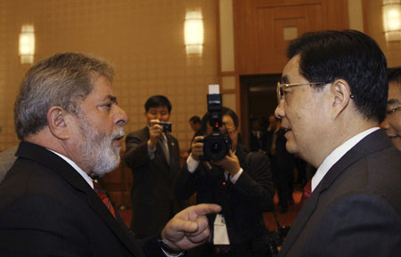Brazil's President Luiz Inacio Lula da Silva (L) talks with Chinese President Hu Jintao after the G20 Summit on Financial Markets and the World Economy in Washington, November 15,2008. [Agencies]