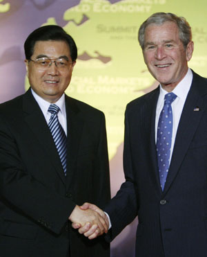 US President George W. Bush (R) greets Chinese President Hu Jintao at the G20 Summit on Financial Markets and the World Economy at the National Building Museum in Washington, November 15, 2008. [Agencies]